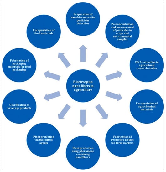 - Noruzi, M. Electrospun nanofibres in agriculture and the food industry: A review. J. Sci. Food Agric. 2016, 96, 4663–4678. [Google Scholar] [CrossRef] [PubMed]