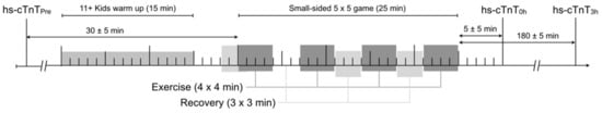 Body weight was measured with a medical scale (SECA 711, Hamburg, Germany), and height was measured with a wall stadiometer (Año-Sayol, Barcelona, Spain). Participants were equipped with a WIMU Pro™ (RealTrack Systems, Almería, Spain) GPS tracker (sampling rate = 10 Hz), which was synced with a Garmin™ heart rate band (Garmin, Ltd., Olathe, Kansas, US). This setup has been validated for both heart rate (R2 = 0.96) and player geospatial tracking (ICC = 0.98) in previous studies [,]. For high-sensitivity cTnT (hs-cTnT), blood samples were analyzed using a Troponin T hs STAT immunoassay in a Cobas E 601 analyzer (Roche Diagnostics, Penzberg, Germany). The detection range of this assay is 3–10,000 ng/L, and the intra-assay coefficient of variation at a mean hs-cTnT of 13.5 ng/L is <10%. The upper reference limit (URL) for hs-cTnT, defined as the 99th percentile of healthy participants, is 13.5 ng/L []. Concentrations below the limit of detection of 3 ng/L were set to 1.5 ng/L for statistical analyses. The rating of perceived exertion (RPE) was obtained immediately after exercise using the CR100 scale, and all participants were already familiar with RPE reporting [].