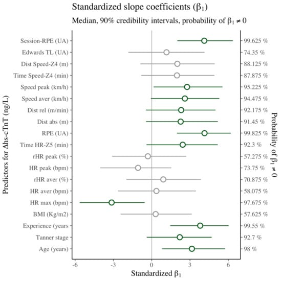 Tracking data were downloaded onto a computer and extracted to a spreadsheet using S Pro ™ software (RealTrack Systems, Almería, Spain). All statistical analyses were then performed using R version 3.5.1 (R Foundation for Statistical Computing, Vienna, Austria). Bayesian models were created in the Stan computational framework [] accessed with the brms package []. Concentrations of hs-cTnT were log-transformed prior to model fitting to achieve a residual normal distribution. Descriptive statistics are presented as the mean ± standard deviation or median (interquartile range). Statistical analyses were performed by fitting Bayesian linear mixed-effects models using Markov Chain Monte Carlo. Since variables were registered on very different scales, data were standardized prior to model fitting to facilitate model convergence and their posterior comparison. After verifying differences in hs-cTnT between baseline and peak values (3 h post), we proceeded by fitting separate models for each variable. The response variable was the hs-cTnT concentration (log-transformed). The reference values for the intercept (β0) were set to time = baseline and each variable at Z = 0. The fixed effects were time = Post 3 h (β1), each variable separately (β2), and their interaction (β3). A random effect for each participant was always included to account for individual variation. The goodness of fit of the models was assessed by the proportion of variance explained (R2). All model parameters (βi) are reported as the median (90% credibility interval), and the likelihood of β ≠ 0 is expressed as the Maximum Probability of the Effect (MPE). Effects were considered highly likely when the MPE was above 90%.