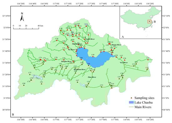 Map showing the location of the 88 sampling sites in rivers of the Lake Chaohu Basin.