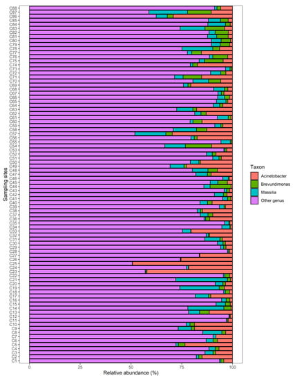 Relative abundances of Acinetobacter, Massilia, and Brevundimonas in the 88 sampling sites of the rivers in the Lake Chaohu Basin.