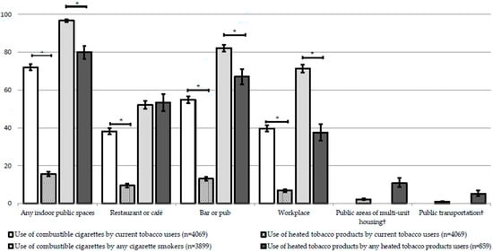 Sutanto, E.; Smith, D.M.; Miller, C.; O’Connor, R.J.; Hyland, A.; Tabuchi, T.; Quah, A.C.K.; Cummings, K.M.; Xu, S.; Fong, G.T.; et al. Use of Heated Tobacco Products within Indoor Spaces: Findings from the 2018 ITC Japan Survey. Int. J. Environ. Res. Public Health 2019, 16, 4862. https://doi.org/10.3390/ijerph16234862