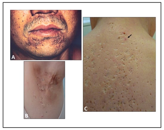 Clinical features of chloracne in patients with Yusho disease, an outbreak that occurred in Japan in 1968. (A) Chloracne in the perioral area in 1968. (B) Scars and cysts from chloracne in the axilla in 2008. (C) Severe crateriform, or punched-out scars, from chloracne on the back in 2008. Inflammatory acneiform eruption still appears frequently (arrow).