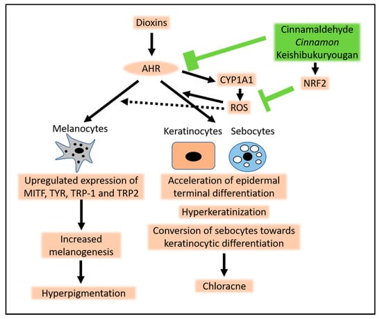 A schema of the pathogenesis of chloracne and hyperpigmentation by dioxins. Dioxins bind to the aryl hydrocarbon receptor (AHR) and induce production of xenobiotic metabolizing enzyme cytochrome p450 1A1 (CYP1A1). CYP1A1 tries to degrade the dioxins, but has little success because dioxins are structurally stable. These unsuccessful efforts give rise to enormous production of reactive oxygen species (ROSs). AHR signaling, together with the oxidative stress, accelerate the epidermal terminal differentiation (i.e., keratinization) in keratinocytes. This also converts sebocytes toward keratinocytic differentiation, which results in the development of chloracne. AHR activation by dioxins also upregulates the expression of melanogenic genes, including microphthalmia-associated transcription factor (MITF), tyrosinase (TYR), and tyrosinase-related proteins 1 and 2 (TYRP1 and TYRP2), and increases melanogenesis in melanocytes, resulting in hyperpigmentation. It is not clear whether ROSs are involved in dioxin-induced hyperpigmentation. Cinnamaldehyde, cinnamon, and the cinnamon-containing herbal drug Keishi-bukuryo-gan inhibit the AHR-mediated CYP1A1 expression. They also activate nuclear factor erythroid 2-related factor 2 (NRF2), upregulate gene expression of antioxidative enzymes, neutralize ROSs, and inhibit chloracne formation.