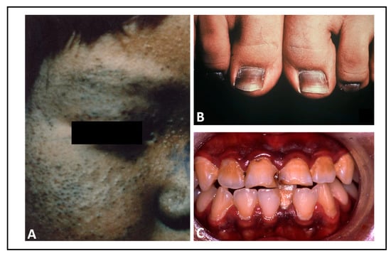 Clinical features of hyperpigmentation in patients with Yusho disease. (A) Hyperpigmentation and chloracne on the face. (B) Ungual hyperpigmentation. (C) Gingival hyperpigmentation.