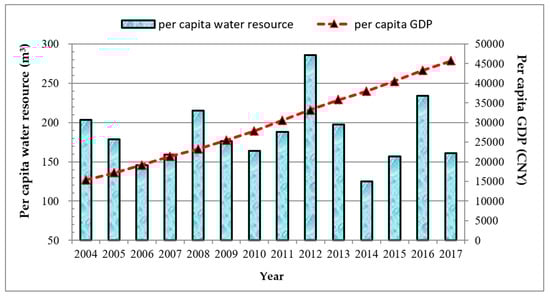The change of per capita water resource and per capita gross domestic product (GDP) in Beijing–Tianjin–Hebei region (BTHR) (2004–2017).