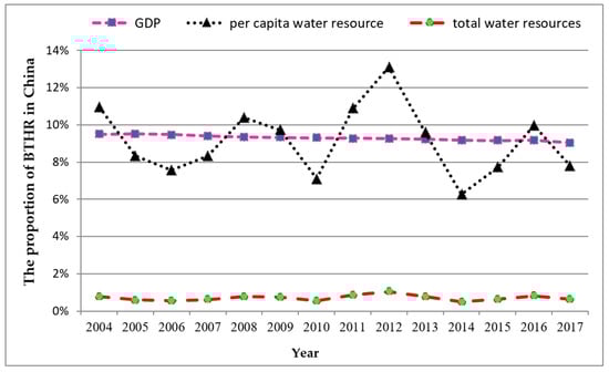 The proportion of Beijing–Tianjin–Hebei region (BTHR)’s gross domestic product (GDP), per capita water resource, and total water resources in China (2004–2017).