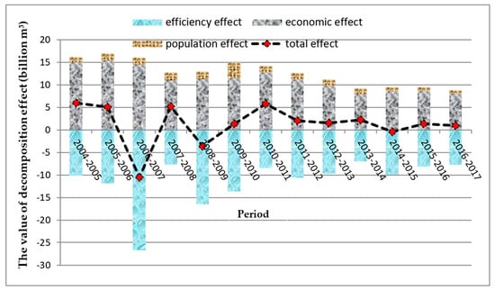According to Equations (9)–(13), the change of water footprint can be decomposed into efficiency effect, economic effect, and population effect using LMDI model. The above calculation results are shown in Table 7 and Figure 4. In Table 7, the total effect () indicating the annual water footprint of BTHR increases by 17.168 billion m3 from 2004 to 2017. Meanwhile, the annual water footprint in this area has increased in most years, and its growth rate generally shows a downward trend. By contrast, the annual water footprint only decreased in 2006–2007, 2008–2009, and 2014–2015, with the largest decrease being in 2006–2007, which was 10.537 billion m3. As for the decomposition effects, the value of the efficiency effect is always negative and shows a trend of fluctuating decline. Thus, water utilization efficiency is the decisive factor of water footprint reduction. From 2004 to 2017, the efficiency effect reduced the water footprint of BTHR by 148.048 billion m3, which contributed the most to the reduction of the water footprint in 2006–2007, reaching 26.658 billion m3, while the contribution was only 6.993 billion m3 in 2013–2014, reaching the minimum value.