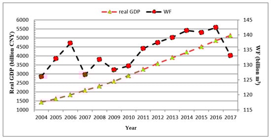 The change trend of water footprint and China’s real gross domestic product (GDP) in Beijing–Tianjin–Hebei region (BTHR) (2004–2017).
