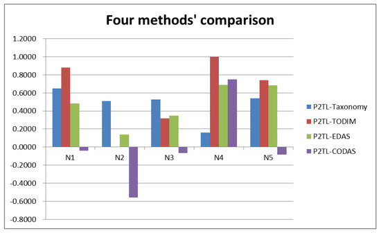 All of these methods have their advantages: (1) P2TLWA operators emphasise the group influences; (2) P2TLWG operators emphasise individual influences; (3) the P2TL-TODIM method based on the prospect theory is a kind of method that considers the influence of the experts’ psychological behavior factors on the decision results; (4) the P2TL-EDAS method uses the P2TL positive and negative distances from the average solution rather than the distances from the ideal solutions to any alternatives as are used in other methods; (5) the P2TL-CODAS method has the precious characteristics of taking the conflicting attributes into consideration and could be more accurate and effective in MAGDM issues; (6) our proposed P2TL-Taxonomy method is very suitable for grading and comparing the advantages and practicalities of different alternatives according to the attributes of the research.