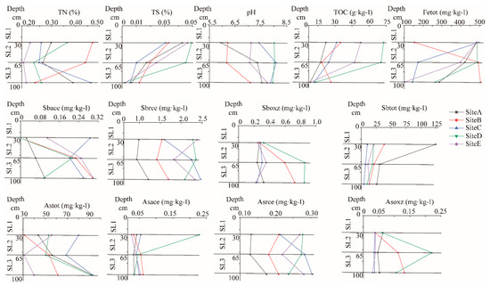 Vertical profiles of geochemical properties. Horizontal lines indicated three layers (SL1, SL2, and SL3) in paddy soil.