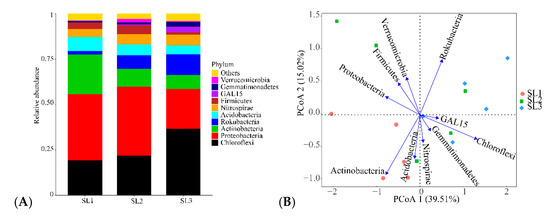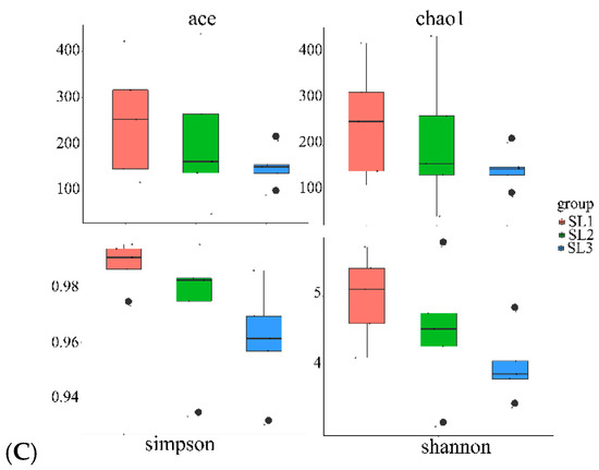 A total of 20 phyla, 66 classes, 153 orders, 243 families, and 325 genera were detected in five profiles. Chloroflexi, Proteobacteria, and Actinobacteria were the dominant bacteria in profiles of paddy soils, accounting for 51.58% to 83.33% of the bacterial community. Chloroflexi increased with depth, while Proteobacteria and Actinobacteria decreased with profiles (Figure 2A). Principal coordinate analysis of dominant bacteria in the top 10 bacterial communities (Figure 2B) showed that the first and second principal axes explained 39.51% and 15.02% respectively. In addition, the bacterial community composition of SL2 and SL3 were higher than that of SL1, and the dominant bacteria of SL1 was Actinobacteria, the dominant bacteria of SL2 was Proteobacteria, and the dominant bacteria of SL3 was Chloroflexi. The community structure of SL1 and SL2, SL1, and SL3 were different, but the difference between SL2 and SL3 was small, and the similarity was large. From the diversity index distribution chart (Figure 2C), ace, Chao1, Shannon, and Simpson indices in SL1, SL2, and SL3 show the same regularity, the largest in SL1, the smallest in SL3, and SL1 > SL2 > SL3.