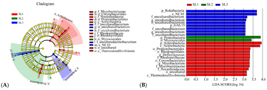 The diversity of taxa and distribution characteristics of species in paddy soils, LEfSe analysis of SL1, SL2, and SL3 bacteria from phylum to genus was carried out (Figure 3). Linear discriminant analysis (LDA) only displayed distinctively indicated species with a significant threshold greater than 3.0. The results showed that 23 differential indicators were detected in three soil layers, and 12, 2, and 9 were detected in SL1, SL2, and SL3, respectively. Among them, Rokubacteria and NC10, Proteobacteria, and Actinobacteria were the indicators with the most significant difference among soil bacterial taxa of SL1, SL2, and SL3.