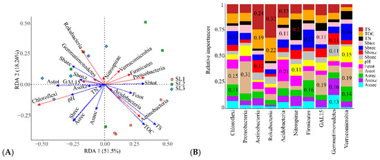 RDA analysis of bacterial phylum level and geochemical properties (A). Relative importance analysis of bacterial phylum level and geochemical properties (B).