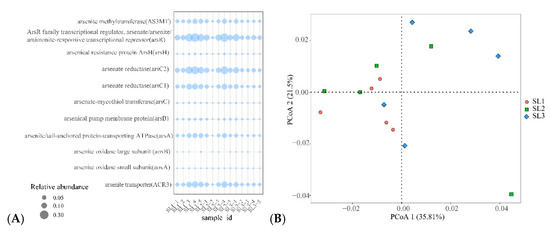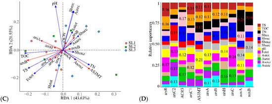 Tax4Fun2 was used to predict 7272 kinds of functional enzymes, including carbon, nitrogen, sulfur, and iron. 11 functional enzymes related to Sb and As including arsR, arsC2, ACR3, arsC1, AS3MT, arsA, arsB, arsH, arsC, aoxA, and aoxB. The relative abundances of aoxA and aoxB in different soil layers are lower, while the relative abundances of arsR, arsC2, and ACR3 in different soil layers were higher. Furthermore, the relative abundance of arsR, arsC2, and ACR3 between SL1 and SL2 was higher than that of SL3 (Figure 5A). According to PCoA analysis (Figure 5B), the composition of functional enzymes in SL1 and SL2 was slightly different. On the contrary, there was significantly different in SL1 and SL3, SL2, and SL3. The relationship between geochemical properties and Sb and As related functional enzymes was further shown by RDA analysis (Figure 5C) and relative importance analysis (Figure 5D). RDA analysis showed that Sbtot, TS, TOC, and Fetot had a positive correlation with arsC2. Asrec. Similarly, pH and Sbrec were positively correlated with arsR and ACR3. The results of relative importance shown that TS, TOC, and Fetot had more considerable influence on arsR. Similarly, Fetot, Sboxz, and Asoxz had a more significant influence on arsC2, and Sbtot, Asrec, and Sbrec had a more significant effect on ACR3.