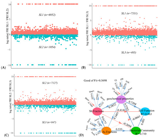 Microbial communities and functional redundant species at different taxonomic levels can ensure the stability of ecosystem processes in response to environmental disturbances [37]. For understanding the difference of bacterial functional redundancy in different soil layers of paddy soil, the functional redundancy index (FRI) in Tax4Fun2 was introduced to compare soil functional enzymes in different soil layers of paddy soil (Figure 7A–C). Higher FRI indicated that specific functional enzymes existed in various species of the bacterial community, while lower FRI indicated that the functional enzymes existed only in a few specific species, and none FRI indicated that there are no such functional enzymes at all. In order to display the FRI values of different soil layers better, the absolute values were obtained after logarithmic conversion. The larger the values (except infinite), the higher the difference of FRI values between the two layers [36]. The results showed that the FRI of SL1 was higher than that of SL2, the FRI of SL1 was higher than that of SL3, and the FRI of SL2 was higher than that of SL3.