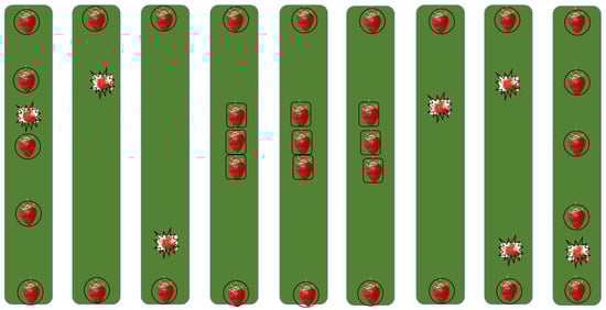 The types and distribution of samples collected in strawberry fields. Note: The rectangle marked strawberries (central strawberries) represent intact strawberries from the center of the field that were often preferred by consumers. The circle marked strawberries (edge strawberries) represent intact strawberries from the outer edges of the field that were also preferred by many consumers. The star marked strawberries (bitten strawberries) represent strawberries that were bitten by animals from surrounding habitats. The green stripes represent planting beds and the white background represents the furrow.