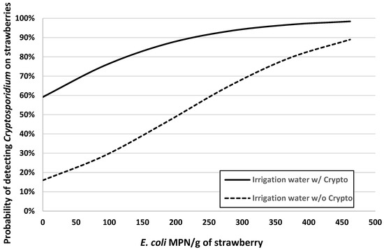 Together, these analyses and figures indicate that strawberries picked during hotter seasons from farms with higher levels of E. coli on their strawberries and Cryptosporidium in their irrigation water are at considerable risk (probability >75%) of being contaminated with this protozoal parasite.