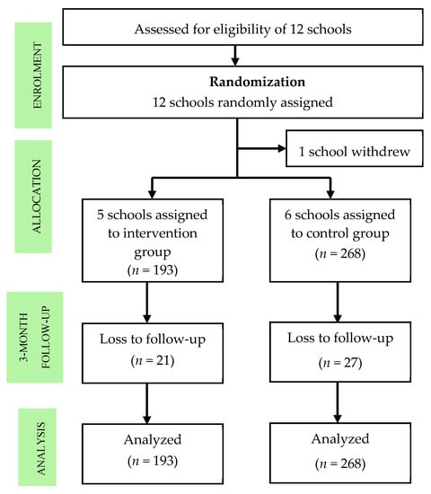This study involved a two-group parallel cluster randomized controlled trial in children attending government primary schools, with the school as the unit of allocation and the individual as the unit of analysis (see Figure 1). The study was undertaken in Jerantut, Pahang, Malaysia, between May 2016 and December 2017. Sampling with probability proportionate to size [32] was used as the sampling method. Twelve government-funded primary schools in a district on the east coast of Peninsular Malaysia were invited to participate in this study through an invitation letter and a brief explanation of the study. Children who could not comprehend and write in English or the Malay language or who were non-citizens were excluded. All children aged 10 and 11 years (Standard 4 and Standard 5) in the participating schools were eligible. The allocated intervention was given to all participants in the intervention groups universally as part of the extra co-curriculum classes.