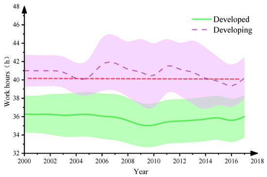 Figure 2 shows a decreasing tendency in the mean hours worked per week in OECD countries. The average number of work hours per capita in OECD developing countries is higher than in developed countries. In addition, the shaded part in Figure 1 denotes the standard deviation of work hours in countries with different levels of development, reflecting considerable fluctuation and less stability in developing countries than in developed countries.