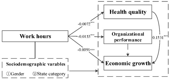 Combining the results of this study, it can be concluded that work hours have a negative relationship with the development of individual, organizational, and social variables. As such, Hypothesis 4 is also verified. Specifically, current work hours cannot effectively promote the quality of individual health, and longer working hours merely play a weak role promoting organizational performance, let alone maintaining effective economic growth (Figure 4). At the same time, the results show that individual levels of health in OECD countries are positive predictors of economic development, and that the impact of organizational performance on economic development is not significant.