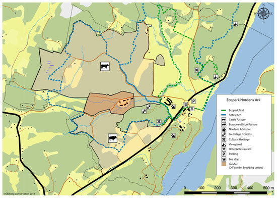 Nordens Ark Zoo is physically located in a region attractive for tourists, with a large number of summer visitors. The foundation owns about 400 hectares of land of which ca 70 ha is the publicly open zoo and the breeding centre. The remaining 330 hectares is agricultural land and forests, which since 2011 has been run as an Ecopark where ecological restoration, education, and research are the focus. The site is located in the nemoral natural geographic region, representing the main part of Western Europe, with forests of deciduous trees like European ash (Fraxinus excelsior), Norway maple (Acer platanoides), European oak (Quercus robur), and a limited presence of coniferous forests, mainly Norway spruce (Picea abies) and Scots pine (Pinus sylvestris) [39,40]. The zoo section is wooded and lies in a more hilly and rocky area of the property, while the remaining part is more and more transformed into pastureland. Many threatened native species of insects and birds that are dependent on a grazed landscape are disappearing from large areas of Sweden. To work against that trend and increase biodiversity, a large part of the former plantation forest is today converted into semi-natural grasslands using mainly cattle (Bos tarus), sheep (Ovis aries), and European bison (Bison bonasus) for grazing. Several facilities have been constructed in the Ecopark to promote visits and experiences of nature such as foot paths, information signs, camp sites, etc. Outreach and education activities is growing year by year in the Ecopark. Since the opening in 1989, the zoo and its animals in combination with the Ecopark surrounding the zoo have been the template for various educational and nature activities, primarily for primary schools as well as for groups of children with special needs. An important part of this activity has been interaction with animals, mainly with farm animals.