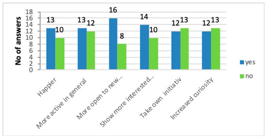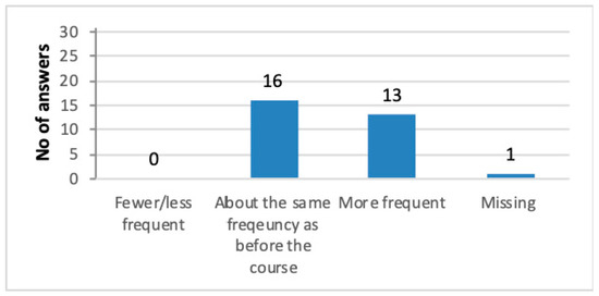 Sixteen caretakers (55%) reported about the same frequency of nature stay as before the course (Figure 4): “It depends greatly on that it isn’t me who decides what we will do, but rather that it is largely the supervisor who is planning my user’s and my activities.”