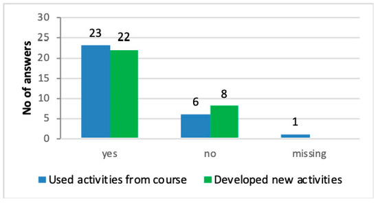 - Whether the caretakers used the activities and the knowledge gained during the courses in their work with their users; e.g., Have activities learned during the courses been practiced with users after the course? Have you developed new animal/nature activities after the course? (response alternatives were yes/no).