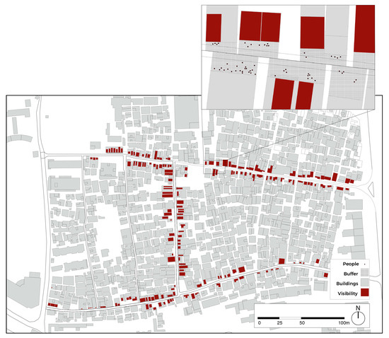 Firstly, the researchers conducted extensive on-site systematic observations of main street spaces and activities. The observations intended to provide a deeper understanding of the types and temporal and spatial pattern of use of the POS. To proceed with data collection, local assistants (Masters’ students) were trained. Data were gained in a dual framework. Firstly, GFFs were harvested from available cartographic information and supplemented with on-site mapping and verification. This method has been chosen due to the limitations in the available sources, the method allowing the acquisition of specific spatial attributes at the building scale. The mapped attributes comprised: Internal degree of visibility (m2), presence of stairs, size of the adjacent POS (m2), and land use. A total of 292 buildings and their adjacent POSs were considered for analysis; these are the buildings with a façade overlooking one of the three main streets of the ViC. Secondly, to perform behaviour mapping, face-to-face interactions in the POS adjacent to each building (georeferenced as a buffer space extending from the outer limit of the building envelop to the centreline of the street) had to be video recorded in order to allow more data accuracy. Subsequently the organization of the dataset was performed. Video recording took place in three different time frames (11:30 am; 2:30–5:30 pm) for two weekend days: Saturday, 6 April 2019 and Sunday, 7 April 2019. Both days presented favourable climatic conditions, the weather being sunny and the average temperature 25 Celsius. The rationale for the choice of two weekend days was the higher pattern of street activities during this period. Observations consisted of persons interacting or potential interactors (individuals not yet engaging in face-to-face interactions) standing or sitting in the POS. Six-hundred and twenty-one observations were collected during the first day, of which 342 were interactors and 279 potential interactors. Five-hundred and seventy-nine observations were collected on the second day, of which 260 were interactors and 319 potential interactors. The total sample size for the whole period is made of 1200 observations, equal to 602 interactors plus 598 potential interactors. Following, every observed individual was captured as a georeferenced point in GIS, and catalogued as interactor (belonging to a group) and potential interactor (standing or sitting alone). Points were categorized as follows: Person sitting, person standing, person in a group, and person alone. The distinction between groups and individuals was based on the literature, specifically stationing individuals were considered as potential interactors. The georeferencing of both behaviours and spatial features allowed the creation of a dataset for further analysis.