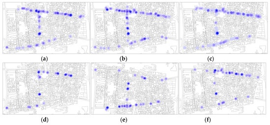 Secondly, following the first map showing the overall merged data, some distinction had to be made to visualize the percentage of individual users of space (non-verbally communicating) compared to persons in groups (already engaged in social interactions). Single maps have been generated distinguishing sitting, standing, individuals, groups, and total number of space users (Figure 6 and Figure 7). The comparison between the maps showed a balance in the percentage between total number of users and individuals. In every time frame and every category, individuals interacting represent a relevant amount of the total number of face-to-face interactions. From the subcategorized maps, a weak sign of ground-level buildings’ functions more correlated to individuals can be observed: Religious buildings and cultural buildings present more POSFTFID. Noticeable, the clustering of POSFTFID in a particular location in front of a residential building appear consistent among several observation periods.