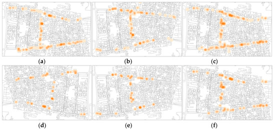 Before proceeding with behavioural mapping and statistical analysis, spatial analysis has been carried out to detect land use (Figure 3) and design-related GFFs (Figure 4). Following, behavioural mapping was employed, and the Kernel density tool used to visualize findings. This function of GIS allows the immediate visualization of the patterns of POSFTFID, with the possibility of breaking down POSFTFID by category and time. Behavioural mapping is one of the most effective and feasible methods to understand the relationship between people and place. It is utilized in many fields of research, including environmental science, social science, and educational research. In urban studies, this method stands out for the focus on spatial patterns of activities, allowing investigation in the relationship between physical space and human behaviour. Methods usually adopted to collect data related to human behaviour rely on video recording. In this research, data are collected by adopting a visual snapshot approach. This method consists of recording people standing, sitting, or moving in the selected urban space. The solidity of the results is achieved by video recording in predefined time-frames [63]. In the case of this study, behavioural mapping allowed to draw preliminary considerations in the associations between spatial morphology and human interactions for an initial understanding of urban dynamics at the ground level of the ViC.