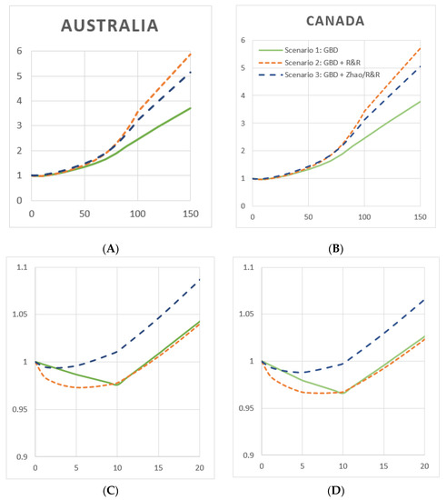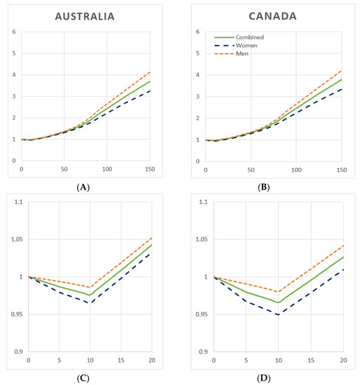 Figure 1 shows RR functions, weighted by gender-combined mortality in Australia (Figure 1A,C) and Canada (Figure 1B,D). Gender-combined mortality weights are shown in Supplementary Table S1. Weighted RR functions, for each of three cardioprotective scenarios, are similar in Australia and Canada, with small differences in the range of 0 to 20 g/day. Using GBD risk functions in Scenario 1, the weighted RR function achieves a minimum at 10 g/day in both Australia (RR = 0.976) and Canada (RR = 0.986). These exposure levels represent the estimated theoretical minimum risk exposure level (TMREL). In Australia, this RR function remains below RR = 1.0 until 13 g/day; while in Canada it is 15 g/day. At higher levels of average daily drinking, all three functions behave similarly in the two countries, with Scenario 2 functions reaching the highest level of risk at 150 g/day (RR nearly 6.0), followed by Scenario 3 (RR ~ 5.5) and Scenario 1 (RR just less than 4.0).
