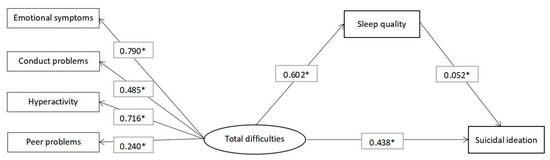 Structural equation model of the relationship between total difficulties, sleep quality and suicidal ideation. Note: Gender and age were the covariates for each variable. * p < 0.001.