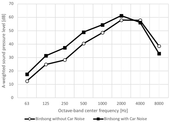 Two types of two-minute long sound recordings recorded in a forest at dawn were used in this study. One is birdsong without road traffic noise, and the other is birdsong with road traffic noise that arises from the passage of three cars (hereon referred to as “car noise”). These sounds were recorded in Shiga highland, Japan. Before the main experiment, in which the sound recordings were produced using headphones to each subject, we conducted a preliminary experiment to adjust the volume to be moderate, where measuring the sound pressure level at ear canal entrance using a dummy head recording system. As a result, the equivalent continuous A-weighted sound pressure levels were 61 dB for “Birdsong without Car Noise”, and 63 dB for “Birdsong with Car Noise”, respectively. Figure 1 shows the octave band levels for the two reproduced sounds. It is seen that the birdsong has dominant components in 2 to 4 kHz bands, whereas the car noise raises the levels by around 10 dB in 250 to 500 Hz bands.