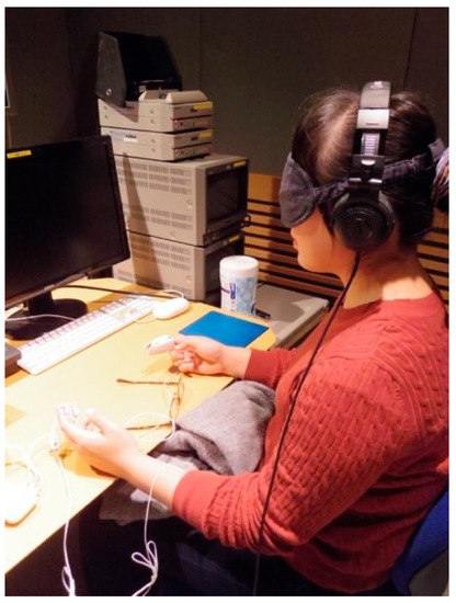 The participants were informed that the study was to investigate how people felt while listening to natural sounds, which was written on the cover page of the PRS questionnaire sheet. Therefore, the participants implicitly gave their informed consent by answering the questionnaire. During this experiment, participants wore a sleep mask and listened to natural sounds using headphones (ATH-PRO500MK2, Audio-Technica Corporation, Tokyo, Japan) so that they could completely concentrate on the sound (Figure 2). Figure 3 demonstrates the protocol of this experiment. Once the participants arrived at the place of the experiment, they were asked to answer the PRS questionnaire, in order to measure their psychological impressions towards the place of experiment as controls. In this study, the PRS was used to investigate whether the contents of acoustic stimuli changed the perceived restorativeness in the place of experiment. Next, a participant put two electrodes to measure the skin conductance level (SCL) on his/her distal phalange of the left forefinger and that of the left middle finger (Figure 4a), and wore a sleep mask and headphones. The SCL was measured by using Biosignalsplux, (PLUX Wireless Biosignals S.A., Lisbon, Portugal) (Figure 4b). After that, the sounds were presented in the following order: baseline (three min, silence), first sound (two min), interval (one min, silence), and second sound (two min). The length of the interval was determined based on the temporal difference between stimulus onset and recovery from a phasic increase in the SCL. According to the Handbook of Psychophysiology [13], the temporal difference between stimulus onset and the point of 50% recovery of a phasic increase in the SCL is around 30 s. Therefore, the interval in this experiment should be longer than 30 s to differentiate effects of the first sound from those of the other sound, but the interval should not be so long that it leaves the participants feeling bored. Thus, a one-minute interval could be considered as appropriate in this study. The order of presenting these sounds was changed for each participant to counterbalance the order effect. After finishing this step, each participant took the sleep mask off so that he/she could use his/her eyes to read the PRS questionnaire items and answer them. The participant listened to the natural sounds in the same order as he/she listened during the precedent SCL measurement period while filling in the PRS; “Birdsong without Car Noise” was being played while he/she was filling in the PRS to evaluate this sound, and “Birdsong with Car Noise” was being played while he/she was filling in the PRS to evaluate this sound. This was to compare the effect of the acoustic stimuli on the perceived restorativeness of the experimental place relatively. After that, the electrodes and the headphones were removed, and the participant was allowed to leave the room.