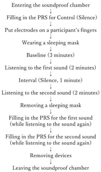 This experiment was conducted in a soundproof chamber in Kashiwa Campus, Department of Natural Environmental Studies, Graduate School of Frontier Sciences, at the University of Tokyo, Japan. There were 14 subjects including unpaid postgraduate students and members of staff. The mean age of the participants was 25.5 years (standard deviation (SD) = 3.11), consisting of six women and eight men. Several studies with physiological measurements were based on experiments with around 15 participants (e.g., 15 participants (four women and 11 men) in Horiuchi et al. [22]; 12 participants (12 men) in Lee et al. [23]). Therefore, the sample size of this exploratory study (14 participants) could also be considered as appropriate for the experimental design. In this study, the gender gap was not considered because we intended to know outcomes regardless of gender. We also limited the participants’ age span to around 25 years old because controlling the age span was considered to be useful to compare the results of this study with those of recent studies or future studies.