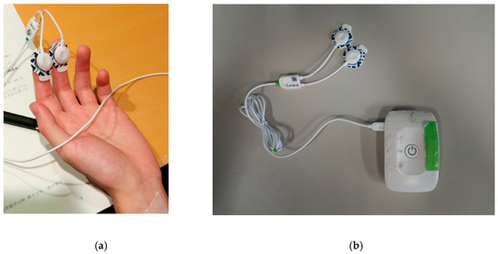 (a) The electrodes for the skin conductance level (SCL) measurement on the left hand. (b) The biosignal sensors (Biosignalsplux) used in this experiment.