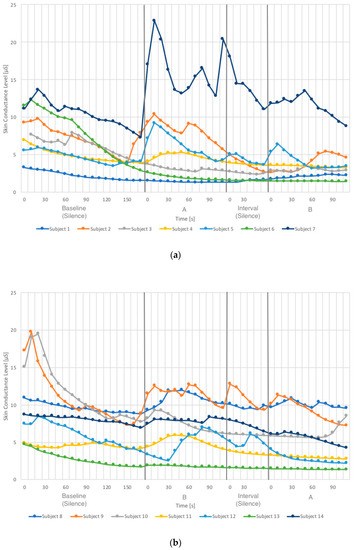(a) The SCL (raw data) of Subjects 1 to 7 when “Birdsong without Car Noise” was presented first. (b) The SCL (raw data) of Subjects 8 to 14 when “Birdsong with Car Noise” was presented first. Higher rate of change of SCL corresponds to higher stress level. A: Birdsong without Car Noise; B: Birdsong with Car Noise. The vertical lines indicate the boundaries between the periods: the baseline, the first listening period (Sound A or B is played), the interval, and lastly the second listening period (Sound B or A is played).