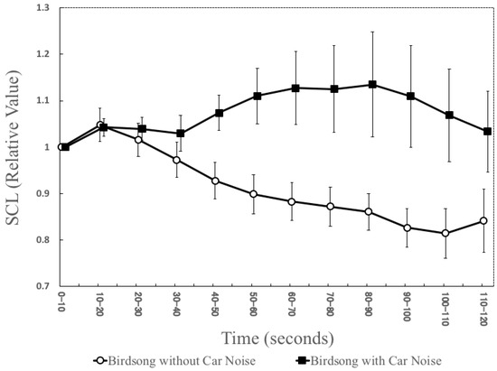 The participants’ SCL value while listening to “Birdsong without Car Noise” and “Birdsong with Car Noise” was analyzed. This value corresponds to the extent to which these acoustic stimuli affect the participants’ physiological response, namely, the degree of the sympathetic nerve activity, which corresponds to the degree of their stress. Figure 5a shows the SCL changes of Subjects 1 to 7, who listened to “Birdsong without Car Noise” first followed by “Birdsong with Car Noise,” and Figure 5b shows that of Subjects 8 to 14, who listened to these sounds in the reversed order. The pattern of change in the SCL differed from person to person; for example, the SCL of Subject 1 fluctuated more than those of Subjects 7 and 13. As these graphs show, the SCL varies among individuals in terms of absolute values and changing patterns, therefore relative values of the SCL were calculated in the following way to compare the physiological restorativeness of the two sounds. First, the mean SCL value in each 10 s during the two-minute listening periods of every participant was calculated. Second, this value in the 10 s periods were normalized by the mean value during the first 10 s (0–10 s) in every participant. This normalized value is the relative SCL value in each participant. Next, the mean value and the standard error of this relative value of all the participants (n = 14) in each 10 s period was calculated.