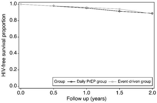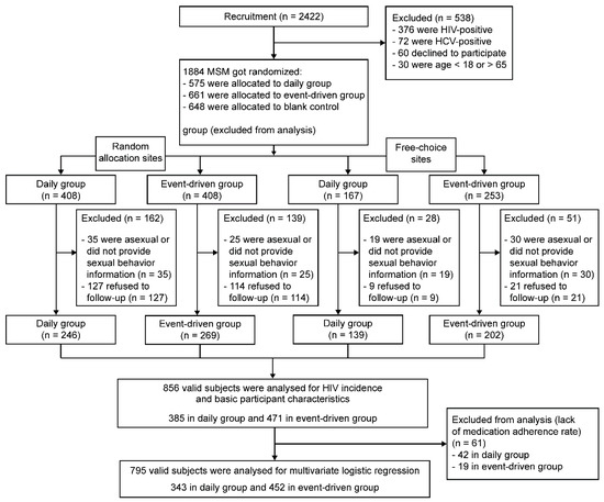 Results: Of the 2422 enrolled MSM, 856 were eligible for statistical analysis (PrEP group: 385 and event-driven group: 471); 30 and 32 subjects in daily PrEP and event-driven groups, respectively, were HIV-positive; the incidence of HIV infection was as follows: daily PrEP group, 6.60 cases/100 person-years and event-driven group, 5.57 cases/100 person-years (relative risk (RR) 95% confidence interval (CI) was 0.844 (0.492–1.449)); HIV incidence did not differ significantly when stratified by medication adherence or sites. When the medication adherence rate was ≥80%, the median TDF serum concentrations were 0.458 mg/L, and 0.429 mg/L in the daily PrEP, and event-driven groups, respectively (not significant;