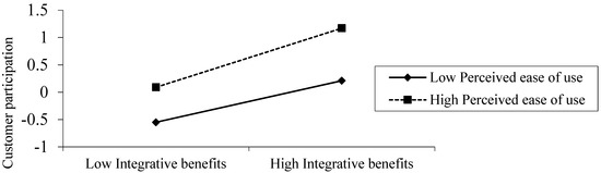 Perceived ease of use plays a positive, moderating role in the relationship between integrative benefits and customer participation. Customers participate in innovation activities for individual status, authority, reputation, and satisfaction. Perceived ease of use effectively promotes problem solving. A convenient virtual community enables customers to maintain relationships and deepen ties, since they are likely to easily meet like-minded people [21]. This deepens the interaction between customers themselves and between customers and enterprises. According to the social exchange theory, an exchange is more likely to occur when the exchange environment is favorable. As show in Figure 2, high perceived ease of use will enhance the effect of integrative benefits and customer participation.