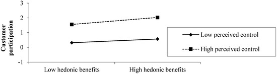 Perceived control moderates the relationship between hedonic benefits and customer participation. Specifically, high perceived control will enhance the effect of hedonic benefits on customer participation, and low perceived control will diminish the effect. Customers with high levels of perceived control believe that their participation will be more meaningful [13] and, hence, will accept products more favorably [23] than those with low levels of perceived control. As shown in Figure 3, high perceived control will enhance the effect of hedonic benefits and customer participation.