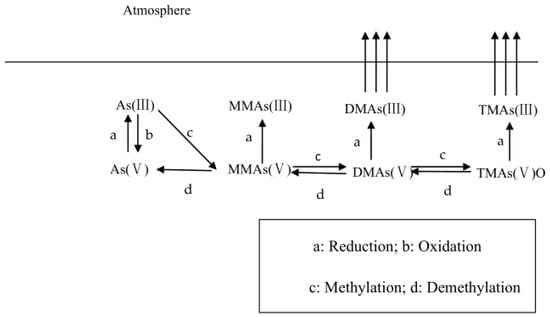 Arsenic can be oxidized, reduced, methylated, and demethylated in soil, processes in which microorganisms play an important role [1]. Methylated arsenic is widespread in nature (Table 1). In soil, methylated arsenic species partially originate from the use of herbicides and pesticides that contain methyl arsenic species and the entry of arsenic-containing wastewater, the major source being methylation mediated by microbes [5]. In rice grains, methylated arsenic species account for 10%–90% of the total arsenic, mainly present as DMAs(V), partly as MMAs(V) and TMAs(V)O [6,7,8]. Studies have shown that the methylated arsenic species in rice result from methylation mediated by microbes in the soil [9]. It has been reported that dimethylmonothioarsenate (DMMTA) was detected in the rice grain [10]. Monomethylmonothioarsenate (MMMTA) and DMMTA are highly toxic to humans [11]. Outside the plant, MMMTA could be dethiolated to MMAs(V) due to abiotic oxidation, but DMMTA was not oxidized abiotically. DMMTA had the highest potential to promote total As accumulation either as DMAs(V) or potentially as DMMTA [12]. The concentration of arsenic in the human body is determined mainly by the arsenic concentration in drinking water and the seafood consumption in the diet. In the body, inorganic arsenic is methylated into MMAs and DMAs, which is mainly excreted in urine together with As(III) and As(V) [13]. In the ocean, the main source of the methylated arsenic contributes to atmospheric deposition [14]. TMAs(III), as the primary volatilized product, volatilized to the atmosphere from the seawater, was oxidized to TMAs(V)O. In the wet and dry deposition, TMAs(V)O was found to be the dominant form of organic arsenic [14,15]. Microbial arsenic methylation affects the migration and transformation of arsenic, thus completing the biogeochemical cycle of arsenic in nature (Figure 1). Arsenic methylation can be considered as a detoxification process, especially in aerobic conditions, whereby low-toxic pentavalent arsenic or volatile arsine removal from environmental media occurs by volatilization [16].