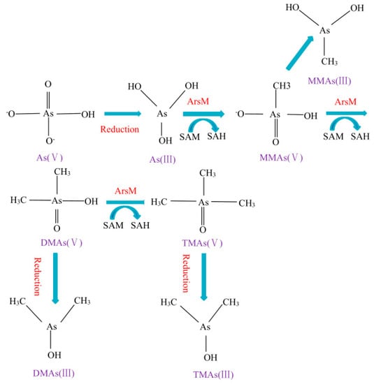 In the process of arsenic methylation, S-adenosylmethionine (SAM) and methylcobalamin can act as the methyl donor for arsenic methylation [27]. In cells, As(V) is reduced to As(III) by GSH. Then, As(III) that is catalyzed by methyltransferase receives a methyl provided by SAM, thus forming MMAs(V) which will be reduced to MMAs(III) by reducing agents. Next, a methyl is added to MMAs(V), thus forming DMAs(V) which will be reduced and added to a methyl, finally forming volatile TMAs(III), and SAM is converted to S-adenosylhomocysteine (SAH) at the same time (Figure 2). Some experiments have shown that methylcobalamine can directly convert As(III) into MMAs(V) and DMAs(V) under reducing conditions, like in the presence of GSH, without the involvement of enzymes [32]. Hayakawa et al. put forward a hypothesis that arsenic–glutathione complex can act as a methyl donor in arsenic methylation [33], however, this hypothesis lacks evidence to explain the role of other reductants, such as Tris (2-carboxyethyl) phosphine (TCEP), as a methyl donor in arsenic methylation.