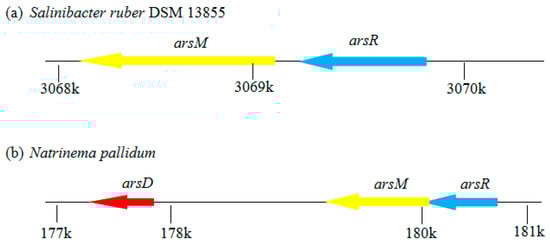 In recent years, preliminary studies on the genetic basis of arsenic methylation have shown that both bacteria and fungi can methylate arsenic, but the products of both are different. The methylated products of bacteria are MMAs and DMAs, while fungi are usually TMAs [27] (Table 2). In bacteria, As(III) methyltransferase (ArsM) is homologous to mammalian AS3MT. It is probable that ArsM functions similarly to AS3MT [37]. These genes encoding homologs of ArsM are divided into two major families: UbiE/Coq5 S-adenosyl-L-methionine-dependent C-methyltransferase and MmtA-like S-/O-methyltransferases, and they are generally close to the genes encoding arsenic-resistance proteins. In bacteria and archaea, arsM is usually regulated by arsenical resistance operon repressor (arsR) and adjacent to or part of an ars operon (Figure 3a,b), indicating that arsM is very likely to be involved in the arsenic detoxification process. However, there is no definite evidence suggesting a regulatory role of ArsR in arsM expression, therefore, it is possible that the expression of arsM is continuous [37]. The ArsM all have similar motifs and conserved regions, and three of them corresponded to the three essential motifs required for the interaction of As and SAM in ArsM [38]. The mechanism of volatilizing arsenic is probably linked with the methanogenesis pathway and certainly involves methylcobalamin as a methyl donor. The ratio between CH3Cob(III) and Cob(I) (Cob(I)alamin), the central intermediate of methanogenesis, was decisive in whether methylation or inorganic hydride generation of metal(loid)s was preferred [28].