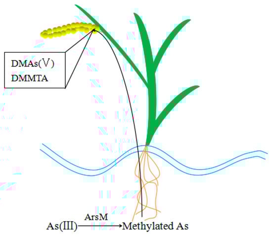 Pesticides containing methylated arsenic, such as DMAs, were thought to be the cause of straight head disease in rice, which may be due to the transfer of methylated arsenic into rice grain after being absorbed (Figure 4) [73]. Furthermore, DMA treatment before flowering can induce abnormal flowers of rice and the seed setting rate can be decreased [74]. Duncan et al. found the same symptom in wheat as in rice when exposed to high levels of DMAs [75]. Though the toxicity of the pentavalent methylated arsenic species absorbed from soil is lower than inorganic arsenic, some experiments have shown that the methylated arsenic in food can be reduced to trivalent methylated arsenic which is more toxic in the gastrointestinal environment, thus increasing the toxicity of arsenic in the human body [76]. Many studies have reported that in higher plants, DMAs(V) tends to show more toxicity than inorganic arsenic [74]. Tang et al. observed that DMAs(V) resulted in more severe oxidative stress than MMAs(V) and As(V). This may be because DMAs(V) cannot be detoxified by the means of complexation with phytochelatins (PCs), while MMAs(V) and As(V) can complex with phytochelatins (PCs). Therefore, the potential risk of methylated arsenic transfer through the food chain in soil should be further studied, perhaps with the aid of some sort of novel closed-loop column leaching systems.