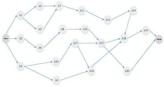 Step 2: Drawing of the project activity network: The project activity network which indicates the precedence relationships between project activities is shown in Figure 3. This network is used to calculate the completion time of the project.