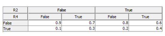 Step 6: Formation of the tables of prior and conditional probabilities: In this section, the prior and conditional probabilities related to primary risks (risks without parents) and also secondary risks (risks with parents) are estimated regarding to the risk interaction network. For instance, Figure 5 shows the conditional probabilities of risk “Poor design“; (R3) regarding its parent risks: “Non-transparent and poorly defined objectives and scope of the project“; (R2) and “Weak communication between the executive team and design team“; (R4).