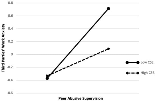 Third parties’ core self-evaluation moderates the relationship between peer abusive supervision and third parties’ workplace anxiety, such that the relationship is weaker when third parties’ core self-evaluation is higher rather than lower.