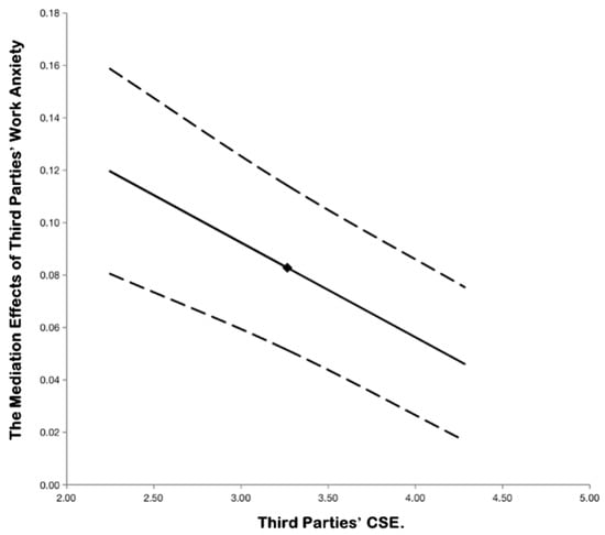 In order to further verify the proposed moderated mediation effects, we used the PROCESS module to further test whether third parties’ core self-evaluation can moderate the mediating role of third parties’ workplace anxiety. The results showed that the index of the moderated mediator is −0.0368, with a 95% confidence interval of [−0.0615, −0.0061], excluding zero. Combined with the results of Table 7, as third parties’ core self-evaluation varied from one standard deviation below the mean to one standard deviation above the mean, the mediating role of workplace anxiety decreases significantly. In other words, when the third parties’ core self-evaluation was at a lower level, the mediating role of workplace anxiety was stronger. Consequently, the moderated mediation effect proposed in the study was established, and hypothesis 6 was further verified. Referring to the interaction with mediators effect plotting method of Edwards and Schurer [66], the moderated mediator chart corresponding to hypothesis 6 is shown in Figure 3.